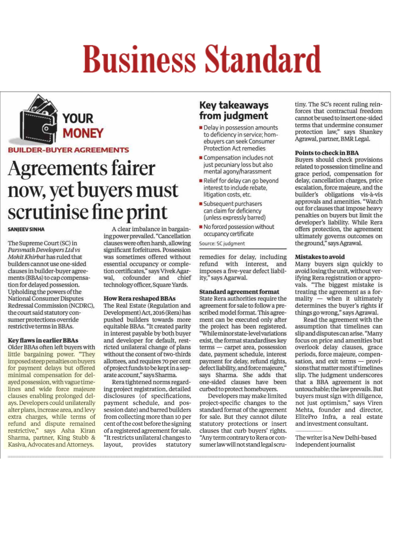 Asha Kiran Sharma has shared her insights in a recent article published by Business Standard, analysing the evolving fairness of builder-buyer agreements and the continuing need for careful contractual scrutiny by homebuyers.