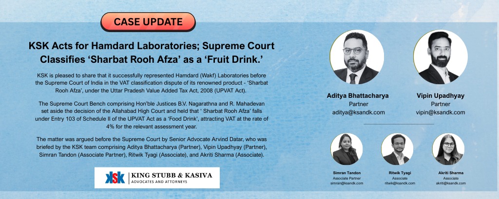 KSK is pleased to announce that it has successfully represented Hamdard (Wakf) Laboratories before the Supreme Court of India in a significant VAT classification dispute concerning its iconic product, ‘Sharbat…