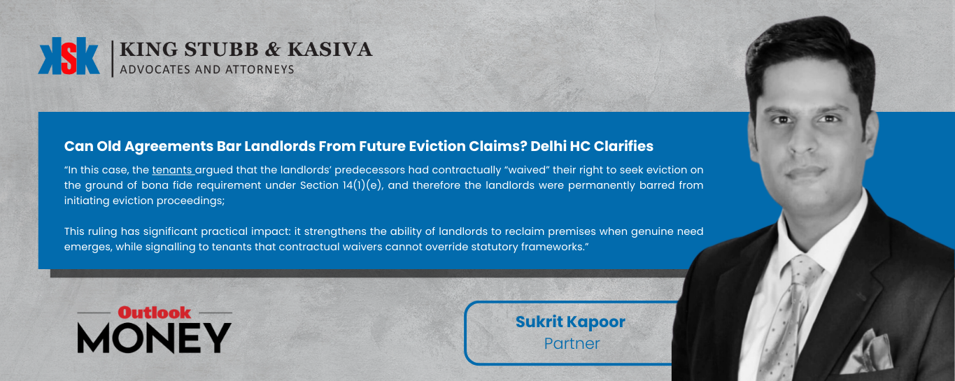 Mr. Sukrit Kapoor, Partner, has been featured in a recent Outlook Money article analyzing the Delhi High Court’s important ruling on whether historic agreements can prevent landlords from initiating future…